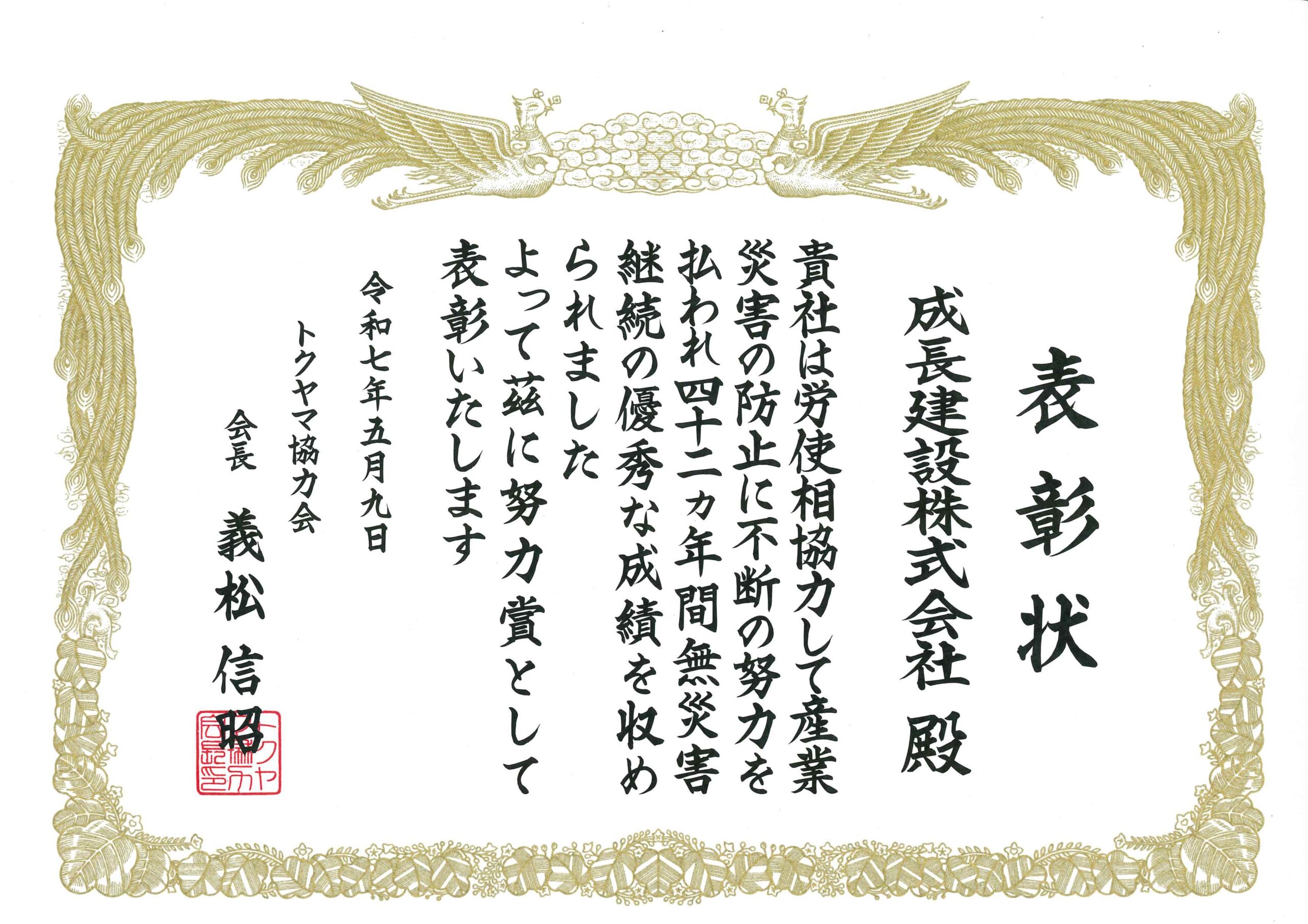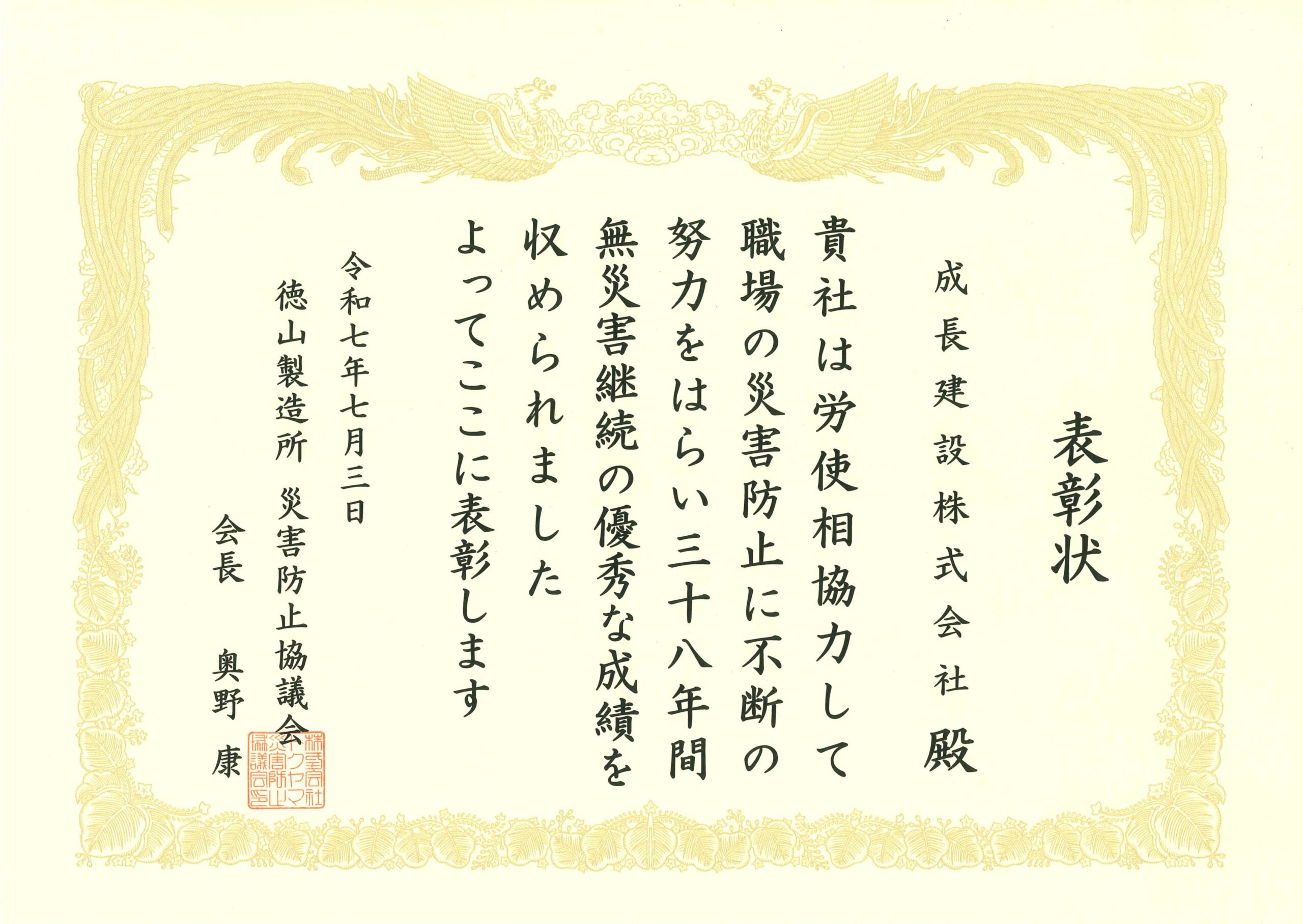 株式会社トクヤマ様(災害防止協議会)より、長年にわたる無災害…