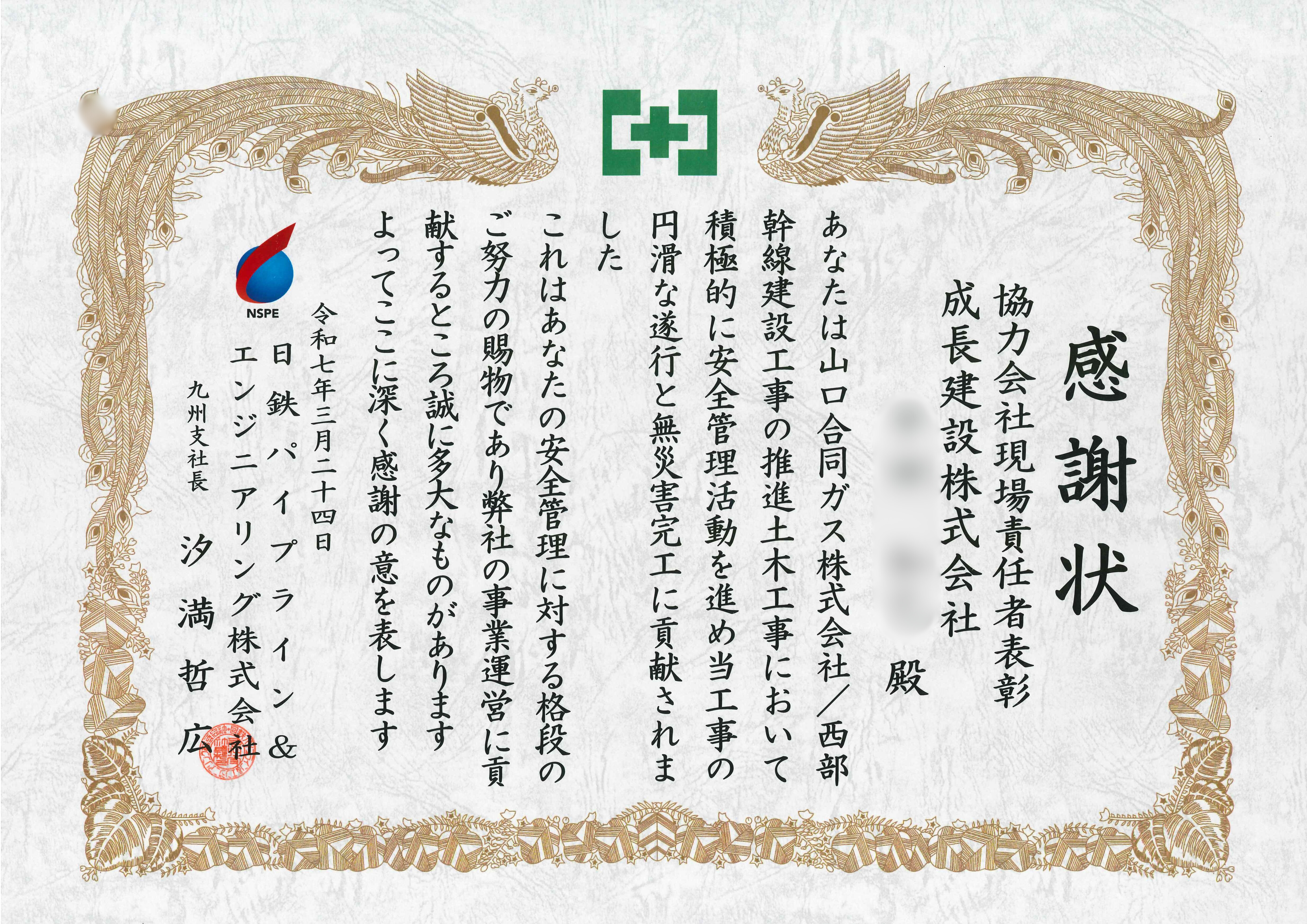 弊社社員が、安全管理に対する功績を称えられ、日鉄パイプライン…