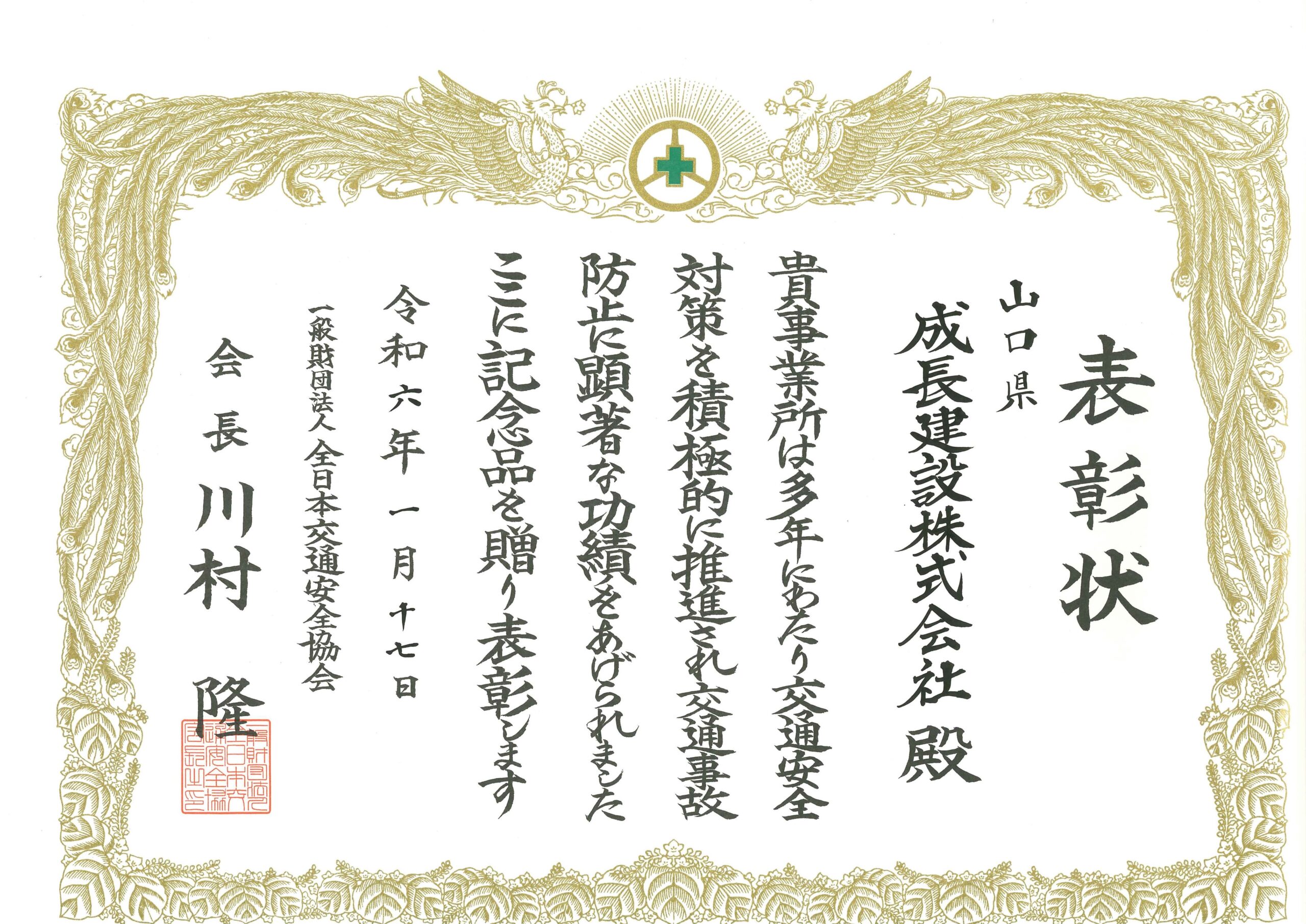 一般財団法人 全日本交通安全協会より、交通安全優良事業所と…