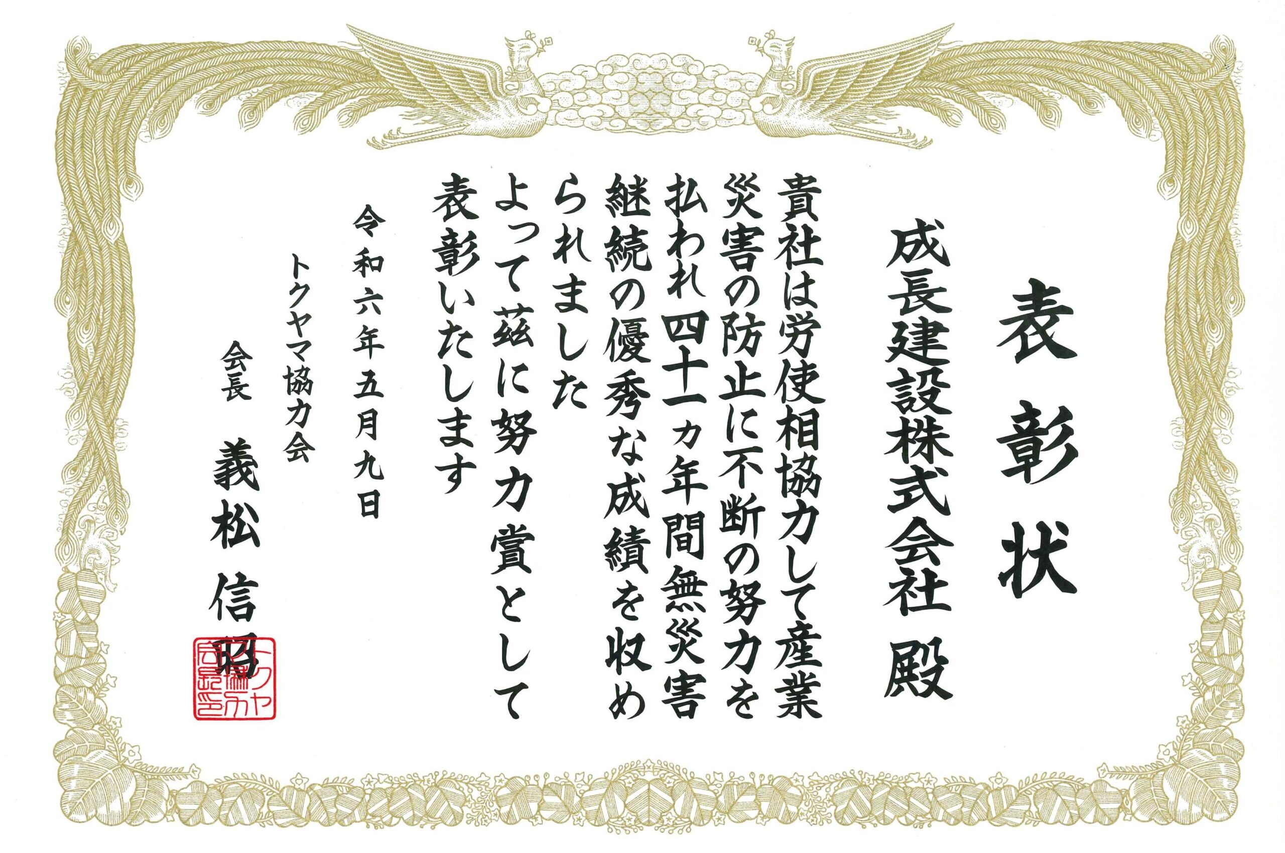 トクヤマ協力会様より、長年にわたる無災害継続に対する表彰状を…