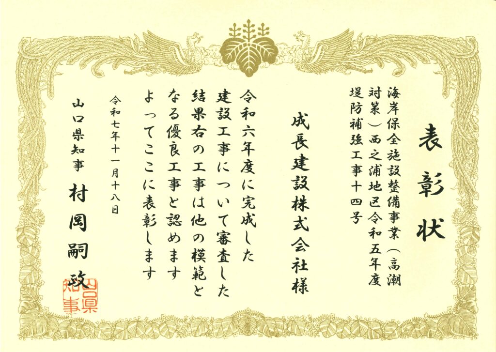 「海岸保全施設整備事業(高潮対策)西之浦地区令和5年度堤防補強工事14号」に対する表彰状をいただきました。